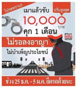 …ด้วยในช่วงเทศกาลส่งท้ายปีเก่าต้อนรับปีใหม่ 2568 นี้ ได้เพิ่มจาก 7 วันอันตราย เป็น 10 วันอันตราย โดยเริ่มตั้งแต่วันที่ 27 ธ.ค.2567 ถึงวันที่ 5 ม.ค.2568 ขอประชาสัมพันธ์ถึงผู้ที่ชอบดื่มแล้วขับ หรือดื่มแล้วไปทำให้เกิดอุบัติเหตุ ในปีนี้มีมาตรการที่เข้มงวดมากขึ้น โดยเฉพาะเมื่อดื่มแล้วขับไปเกิดอุบัติเหตุ ไม่ว่าจะมีคู่กรณีหรือไม่มีคู่กรณีก็ตาม เมื่อเข้าโรงพยาบาลแล้วจะมีการตรวจแอลกอฮอล์ทุกราย (ไม่มีใบขับขี่ ค่าแอลกอฮอล์ต้องไม่เกิน 20 มิลลิกรัม มีใบขับขี่ ต้องไม่เกิน 50 มิลลิกรัม) แล้วถ้าเจอจะถูกดำเนินคดีเมาแล้วขับ และจะมีการตรวจสอบในช่วง 1 ปีที่ผ่านมาว่ามีการกระทำผิดมาแล้วหรือไม่ ถ้ามีจะถูกทั้งปรับและจำคุกทันที และในกรณีที่ไม่ยอมเป่าจะถือว่าผู้ที่ไม่ยอมเป่าเท่ากับเมาทันที