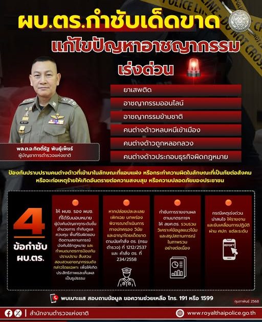 … ผบ.ตร. กำชับ ตามที่ รัฐบาล และ ตร. มีนโยบายเร่งด่วนในการแก้ไขปัญหายาเสพติด ปัญหาอาชญากรรมออนไลน์ อาชญากรรมข้ามชาติ คนต่างด้าวหลบหนีเข้าเมืองโดยผิดกฎหมาย และคนต่างด้าวถูกหลอกลวงหรือประกอบธุรกิจผิดกฎหมายซึ่ง ตร. ได้มีมาตรการให้หน่วยปฏิบัติตามนัยหนังสือ ตร. ด่วนที่สุด ที่ ๐๐๐๗.๓๓/๓๑๖ ลง ๒๓ ม.ค.๖๘ ตลอดจนการป้องกันปราบปรามคนต่างด้าวที่เข้ามาในลักษณะที่แอบแฝงหรือกระทำความผิดในลักษณะที่เป็นภัยต่อสังคม หรือจะก่อเหตุร้ายให้เกิดอันตรายต่อความสงบสุขหรือความปลอดภัยของประชาชน หรือความมั่นคงแห่งราชอาณาจักร อันส่งผลต่อภาพลักษณ์หรือประสิทธิภาพในการบังคับใช้กฎหมายของสังคมโดยรวม จึงกำชับให้ทุกหน่วยดำเนินการ ดังนี้