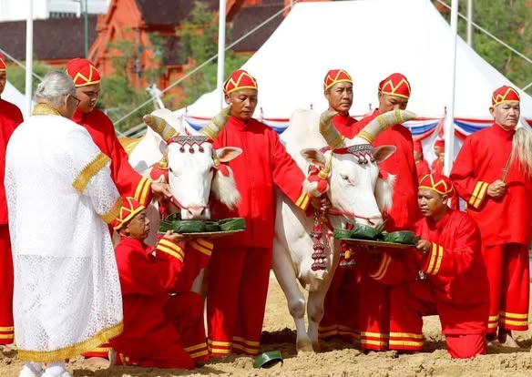 พระยาแรกนาเสี่ยงทายผ้านุ่ง 5 คืบ และพระโคกินน้ำ หญ้า และเหล้า