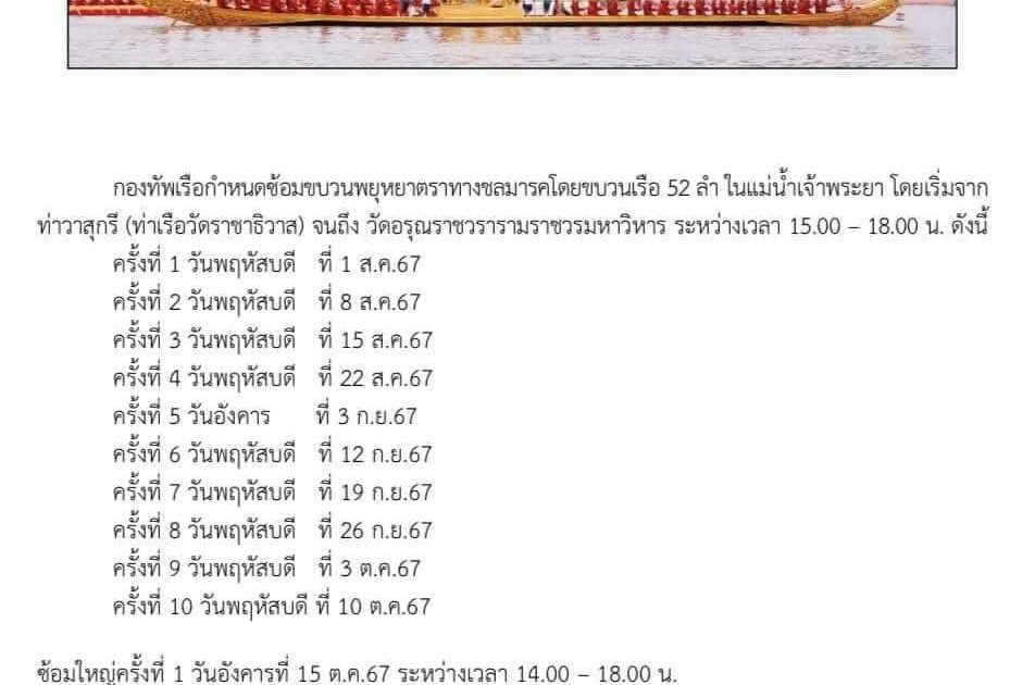 1. สามารถเข้าชมเรือพระราชพิธีได้ที่ อู่ทหารเรือธนบุรี ตั้งแต่ วันนี้เป็นต้นไป เวลา 08.30 – 16.30 น. หากจะชมการฝึกซ้อมฝีพาย ตั้งแต่ 8 ก.ค. 67 เป็นต้นไป เวลา 13.30 -16.30 น.