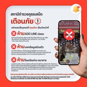 …ด้วยขณะนี้มีมิจฉาชีพ แอบอ้างเป็นเจ้าหน้าที่ตำรวจ สภ.เสม็ด โดยใช้ไลน์ สภ.เสม็ด ปลอม หลอกลวงผู้เสียหายให้โอนเงินเพื่อตรวจสอบเส้นทางการเงิน โปรดอย่าหลงเชื่อโดยเด็ดขาด ติดต่อสอบถามเพิ่มเติม โทร. 038-467000 หรือ 086-1575500 ได้ตลอด 24 ชั่วโมงครับ …