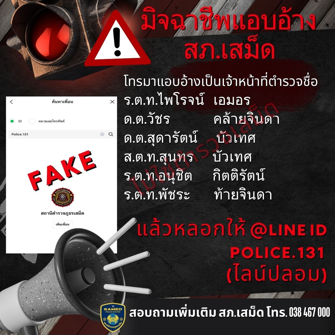 มิจฉาชีพแอบอ้างเป็น ตำรวจ สภ.เสม็ด ชื่อดังนี้ 1. ร.ต.ท.ไพโรจน์ เอมอร ( ไม่เป็น จนท สภ.เสม็ด ) 2. ด.ต